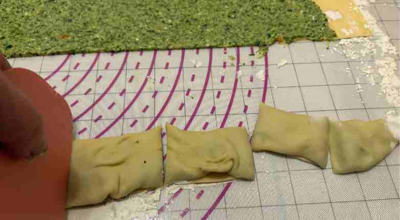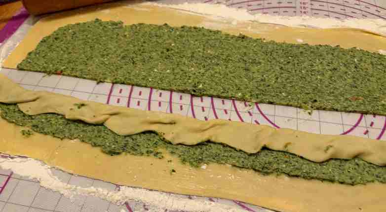 Die Füllung wird mittig als Streifen aufgetragen. Danach wird der Teig geteilt, die Ränder mit Eiweiss bestrichen und zweimal eingeschlagen. Mit dem Stil eines Teigschabers werden die Maultaschen abgedrückt und anschließend sauber durchgeschnitten.