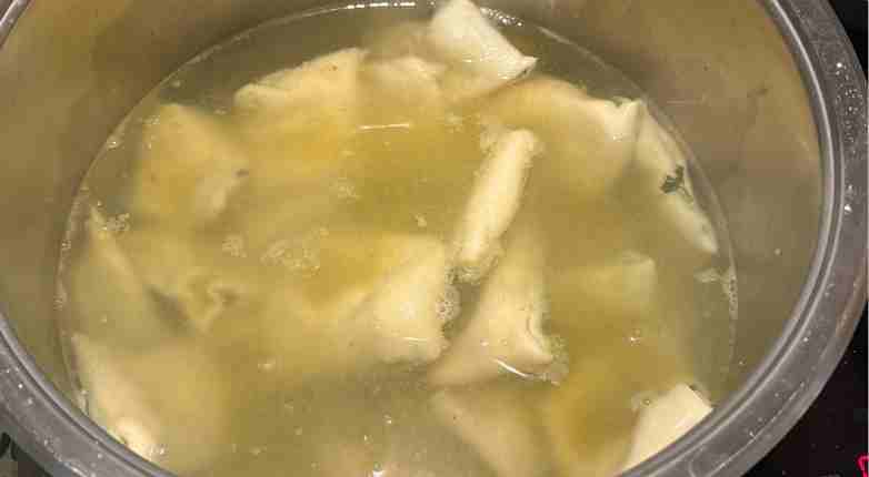 Die fertigen Maultaschen werden in heißer Brühe gegart. Wichtig ist, dass sie nicht kochen, sondern nur sanft ziehen – etwa 15 Minuten lang.