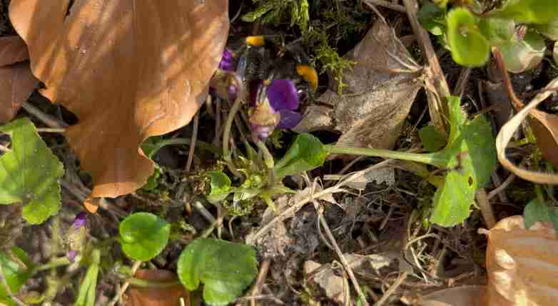 Diese erwachen nach dem Winter aus ihrer Kältestarre und sind dringend auf energiereiche Nahrung angewiesen. Veilchen gehören zu den ersten verlässlichen Nahrungsquellen. Beim Sammeln von Nektar übernehmen die Hummeln gleichzeitig die Bestäubung der Pflanzen – eine klassische Win-win-Beziehung.